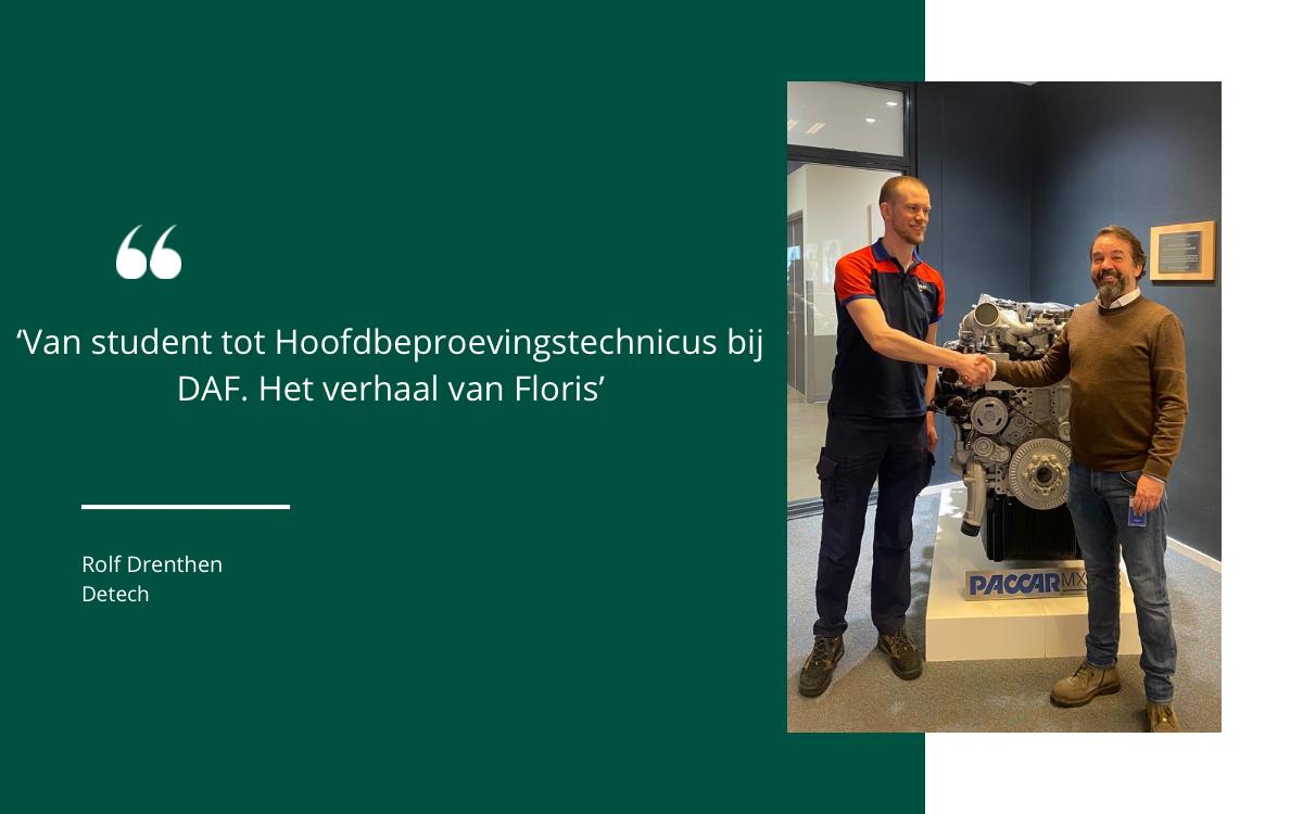 Inmiddels heeft Floris een contract aangeboden gekregen door DAF zelf. Een mooie stap, die volgens hem mede mogelijk is gemaakt door de betrokkenheid en ondersteuning vanuit Détech en in het bijzonder door de begeleiding van Rolf en Melvin.